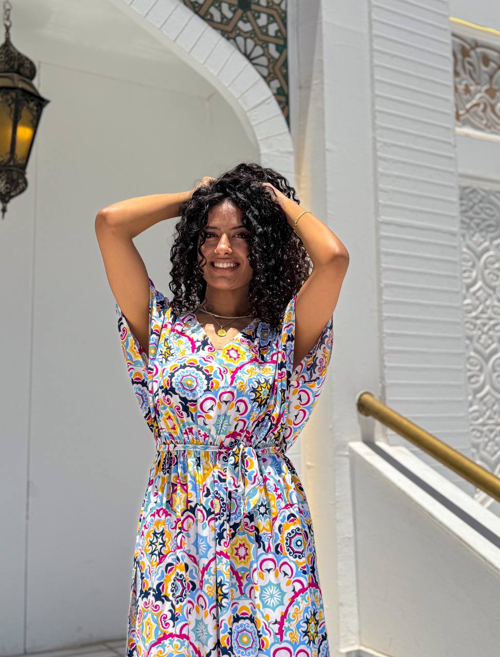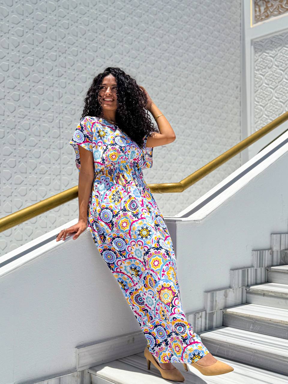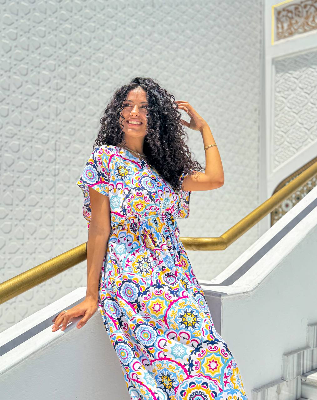 ارتقي بأسلوبك اليومي مع فستان كاجوال مصنوع من مزيج ناعم وقابل للتنفس من الفيسكوز والقطن. صُمم هذا الفستان ليمنحك الراحة المطلقة، ويتميز بنقشة فسيفسائية نابضة بالحياة تضيف لمسة من الأناقة والجاذبية. يأتي بقصة خصر مشدودة لإبراز القوام بشكل أنثوي، وتصميم انسيابي يضمن حرية الحركة. الأكمام الواسعة القصيرة تمنحك إحساسًا بالراحة، مما يجعله خيارًا مثاليًا للمشاوير اليومية، والتجمعات الصيفية، وأيام العطلات