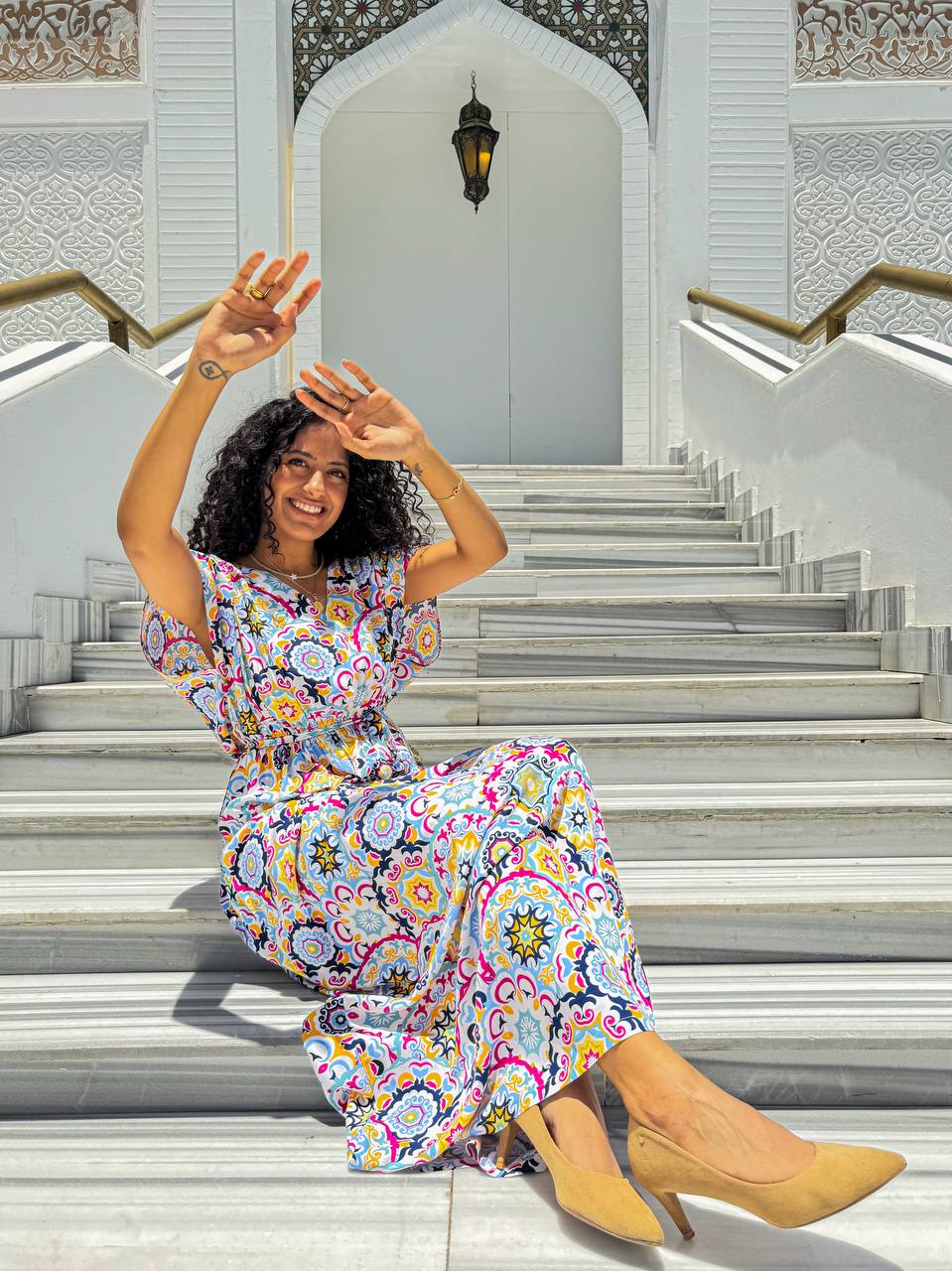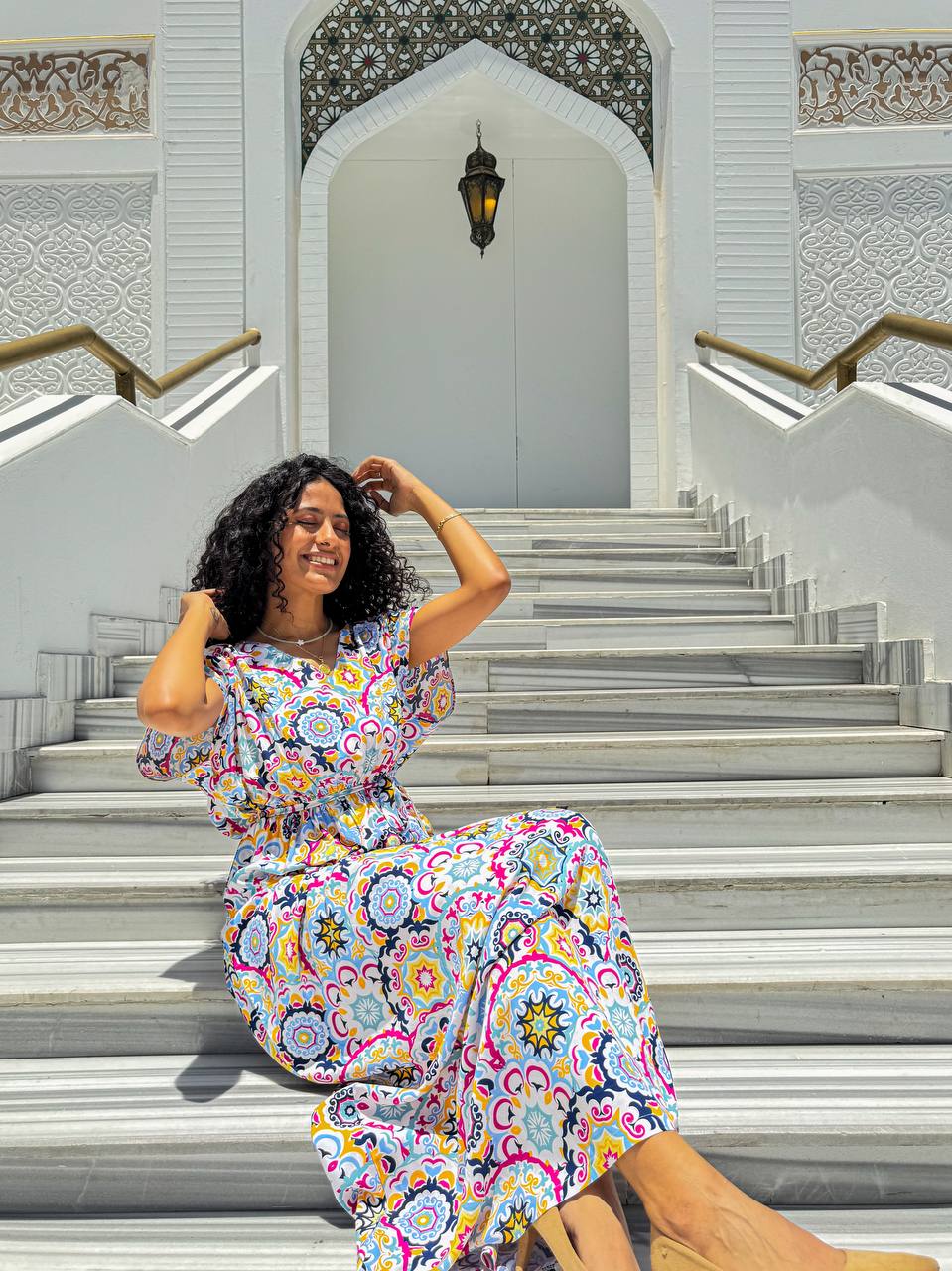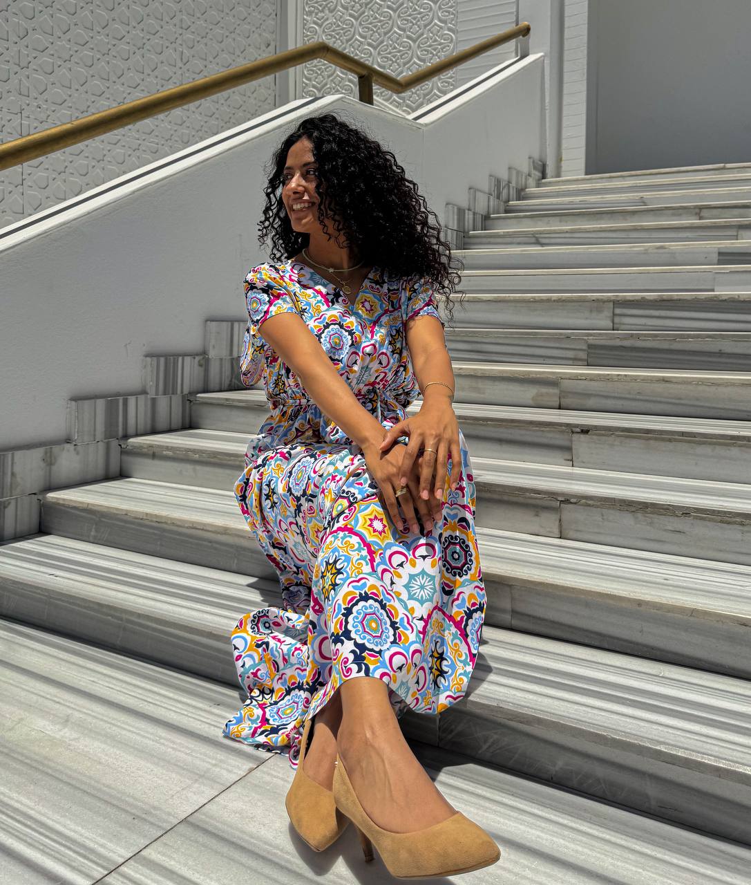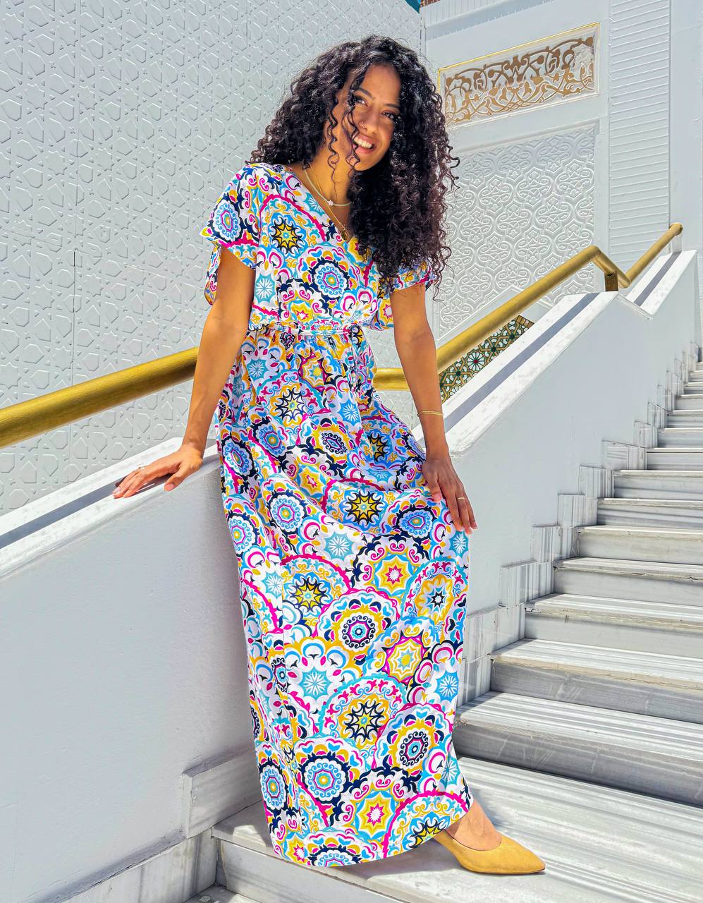 ارتقي بأسلوبك اليومي مع فستان كاجوال مصنوع من مزيج ناعم وقابل للتنفس من الفيسكوز والقطن. صُمم هذا الفستان ليمنحك الراحة المطلقة، ويتميز بنقشة فسيفسائية نابضة بالحياة تضيف لمسة من الأناقة والجاذبية. يأتي بقصة خصر مشدودة لإبراز القوام بشكل أنثوي، وتصميم انسيابي يضمن حرية الحركة. الأكمام الواسعة القصيرة تمنحك إحساسًا بالراحة، مما يجعله خيارًا مثاليًا للمشاوير اليومية، والتجمعات الصيفية، وأيام العطلات