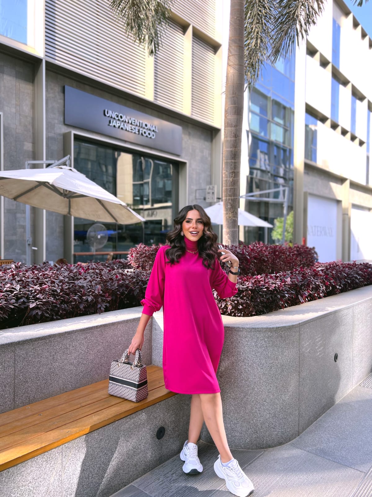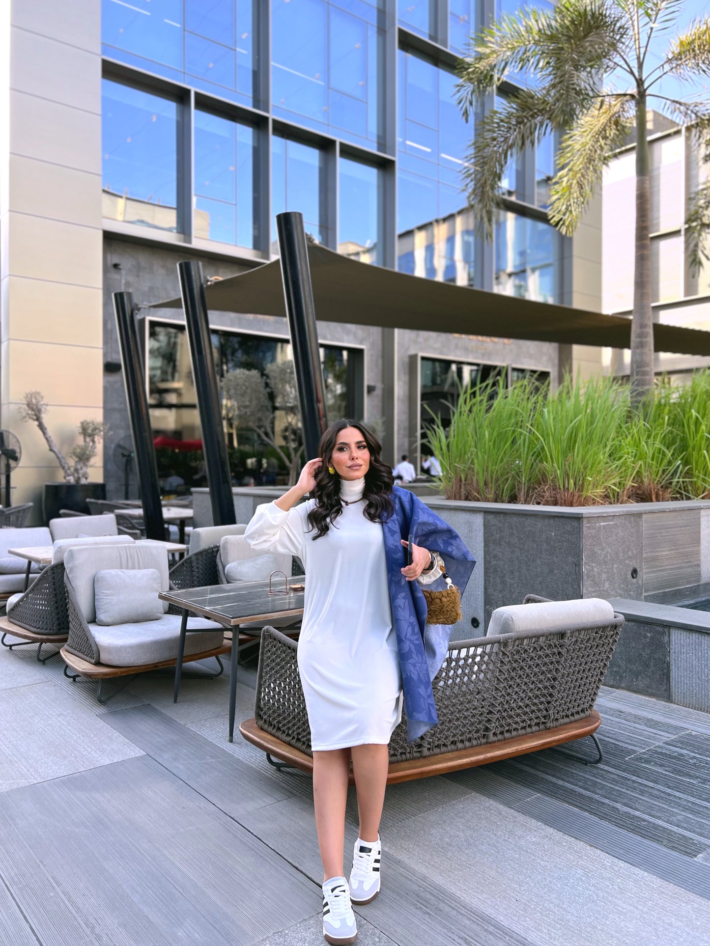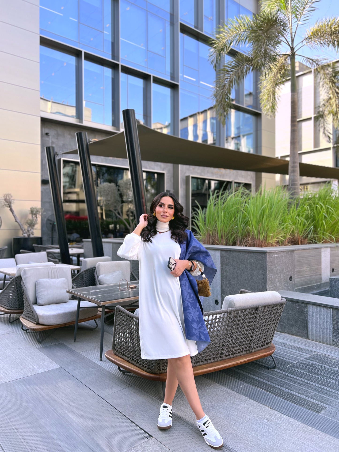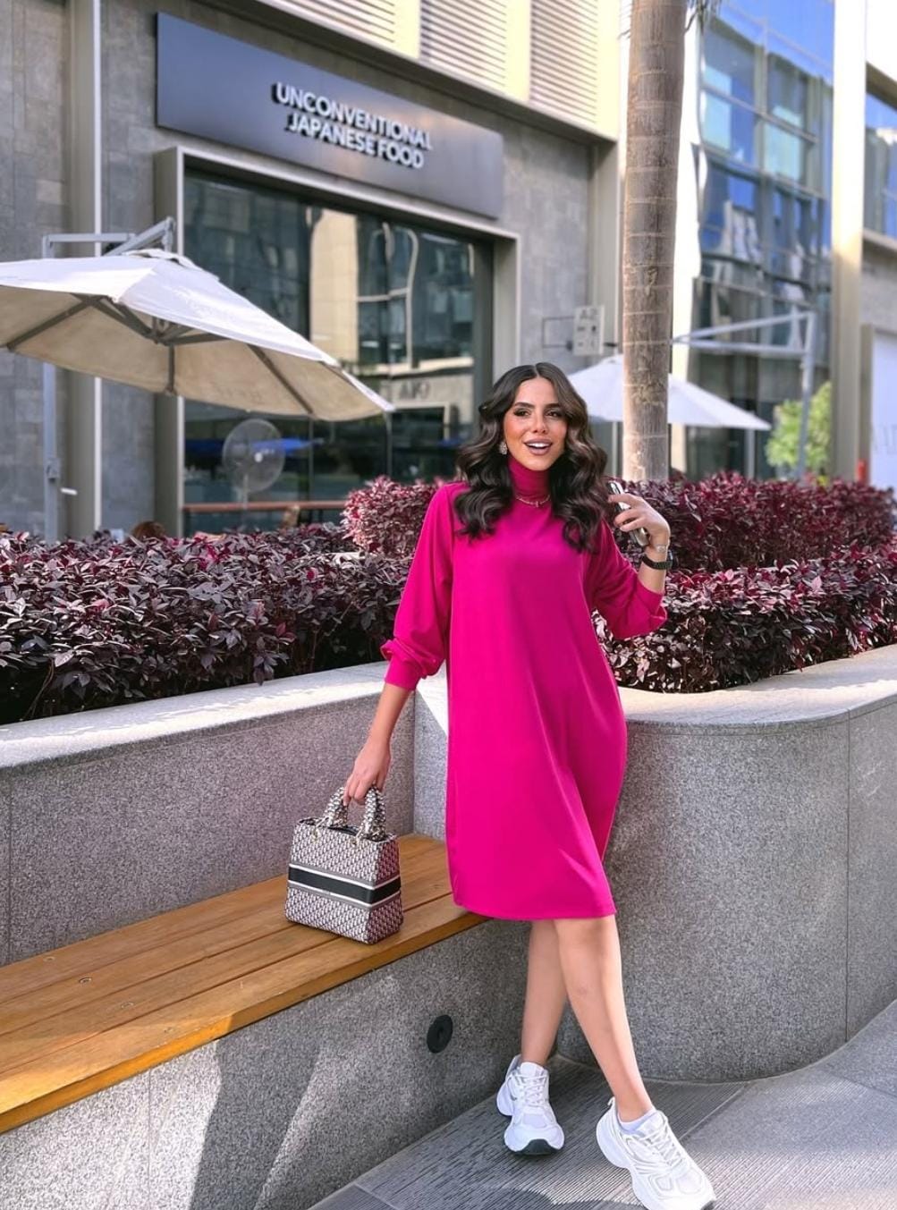 ارتقي بإطلالتكِ مع فستان كاجوال بأكمام طويلة وياقة عالية.