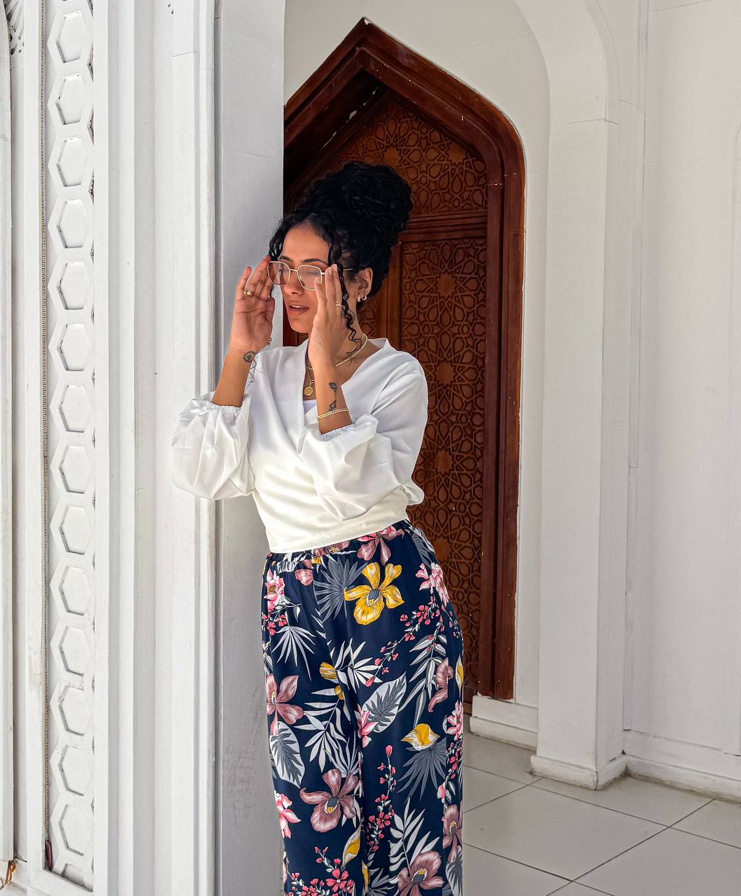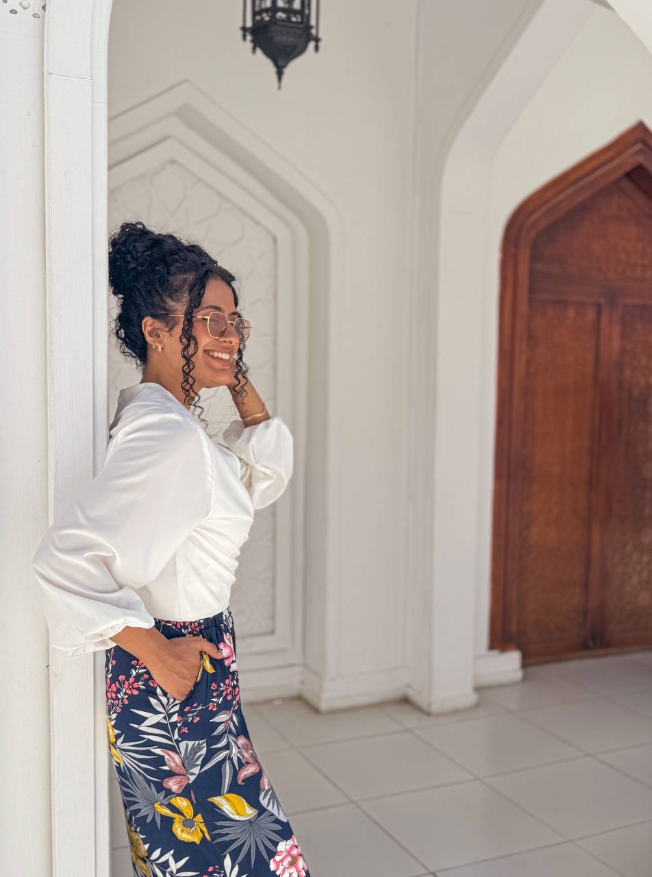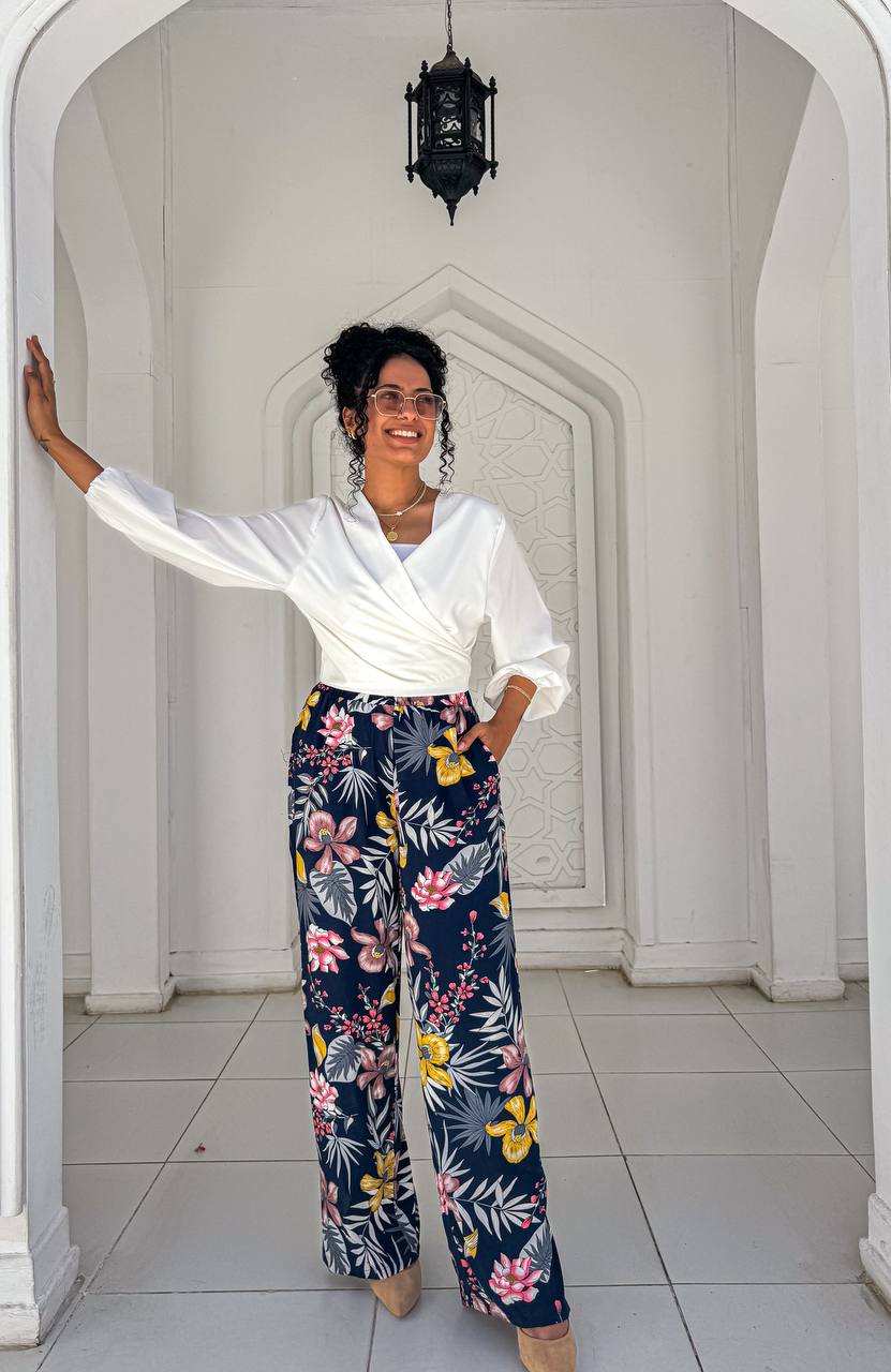 بنطال مريح بنقشة زهور ملونة تضيف لمسة من الحيوية والأناقة. بقصته الواسعة المريحة، يُعد خيارًا مثاليًا للمشاوير اليومية أو الإطلالات المميزة.