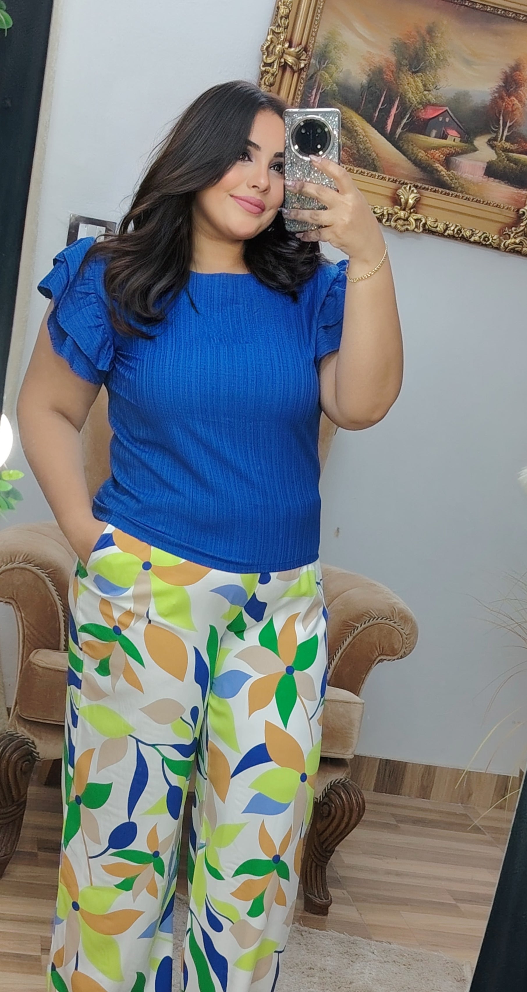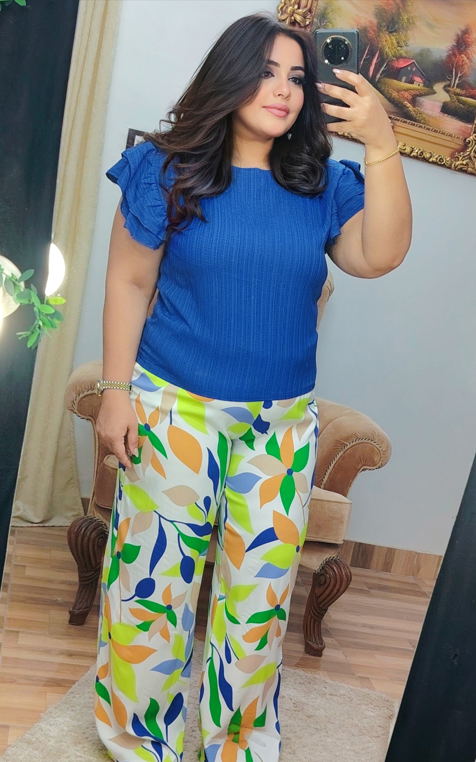 بنطال واسع بنقشة الورود ملونة مستوحاة من الطبيعة، يجمع بين الراحة والتميّز. قصّته المريحة وقماشه الخفيف يجعله مناسبًا لأيام الصيف والمناسبات المختلفة.