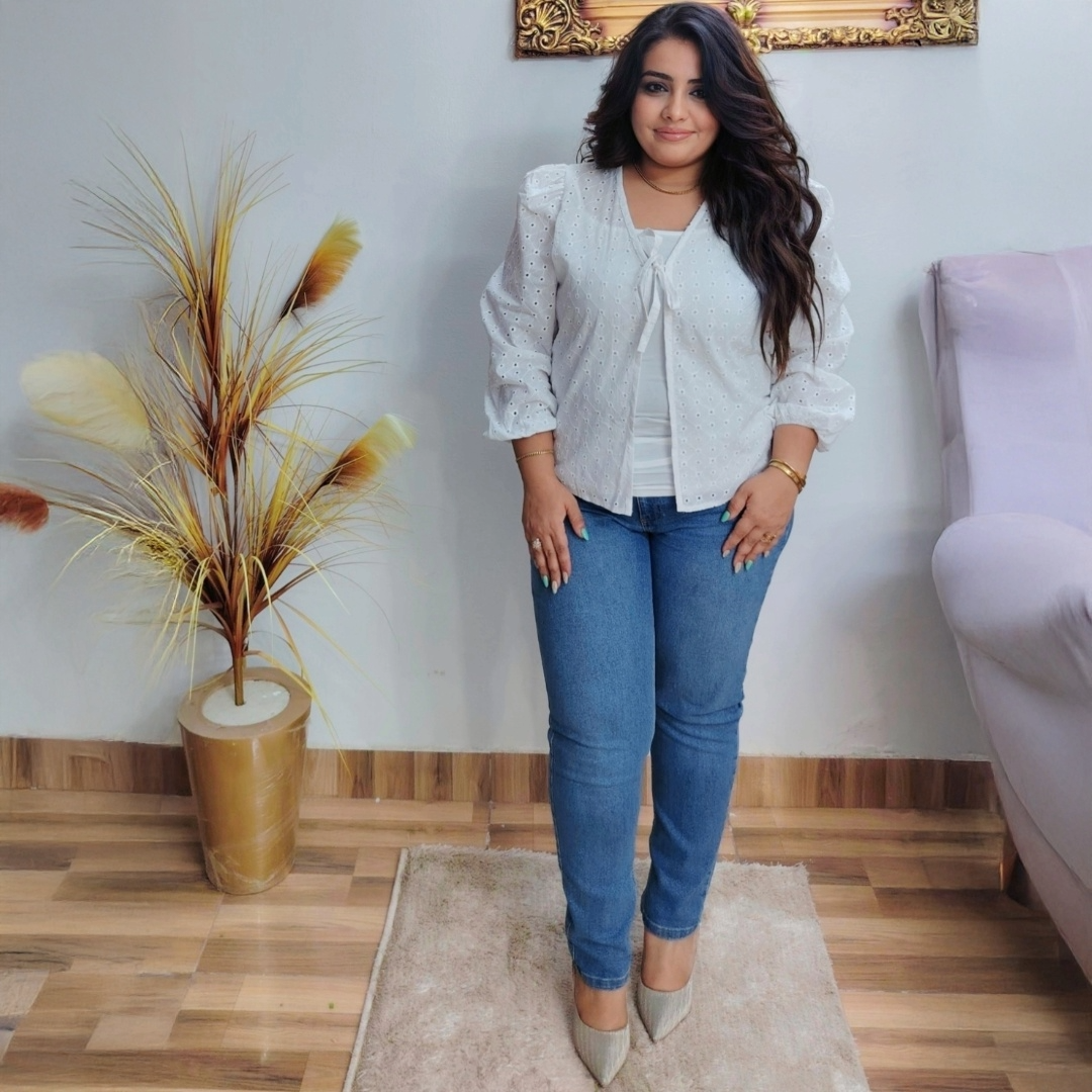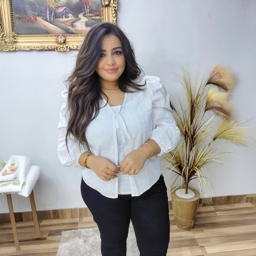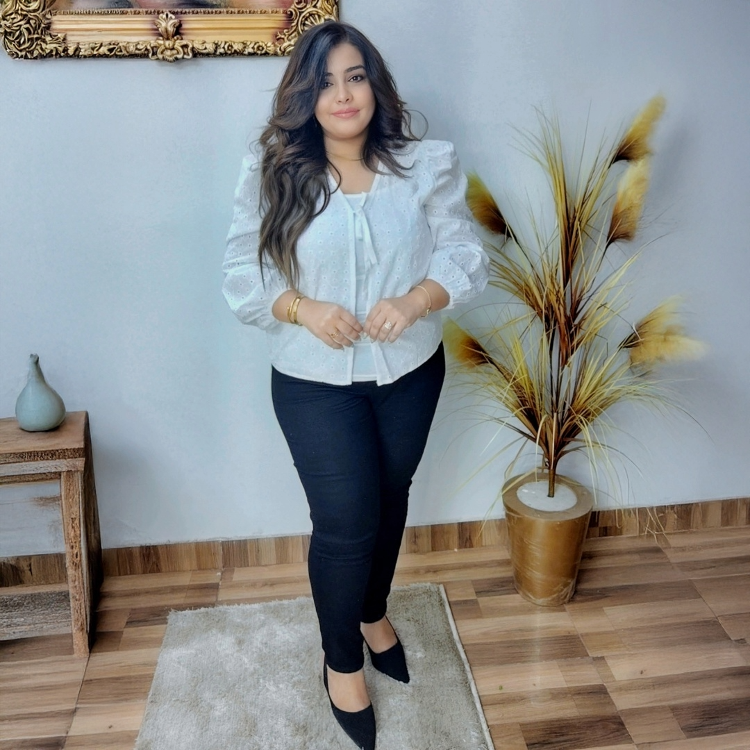 بلوزة قطنية بيضاء بتطريز مثقّب رقيق وأكمام منفوشة مع ربطة أمامية. مثالية مع الجينز أو التنانير لإطلالة كاجوال أنيقة.
