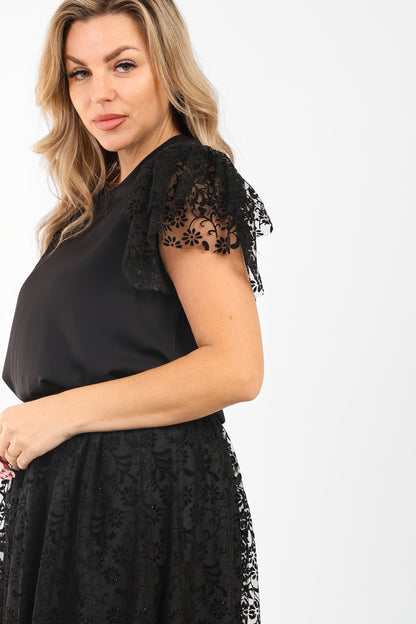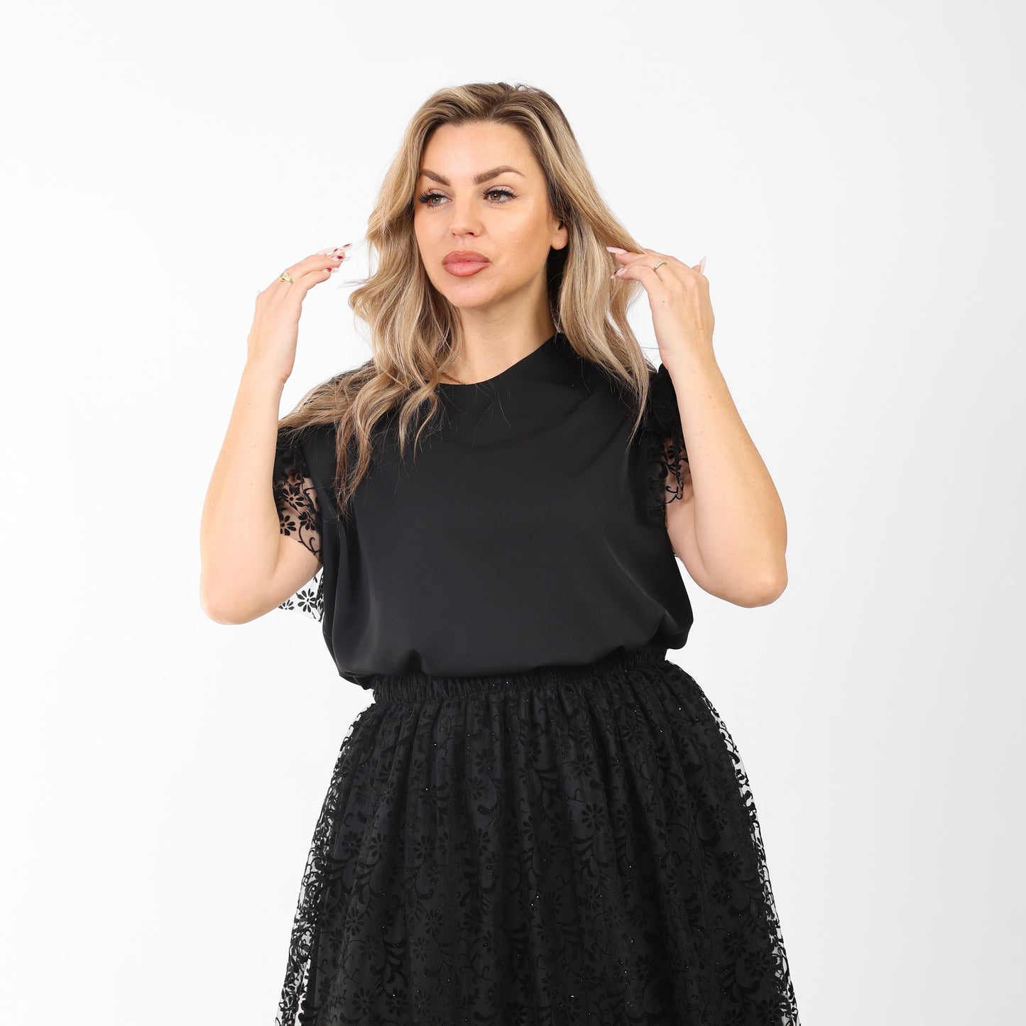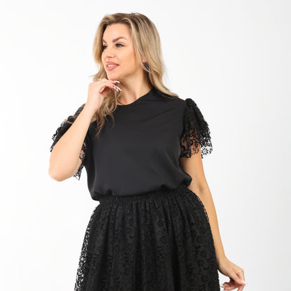 An elegant soft crepe blouse in black, featuring beautifully embroidered lace sleeves for a feminine touch.