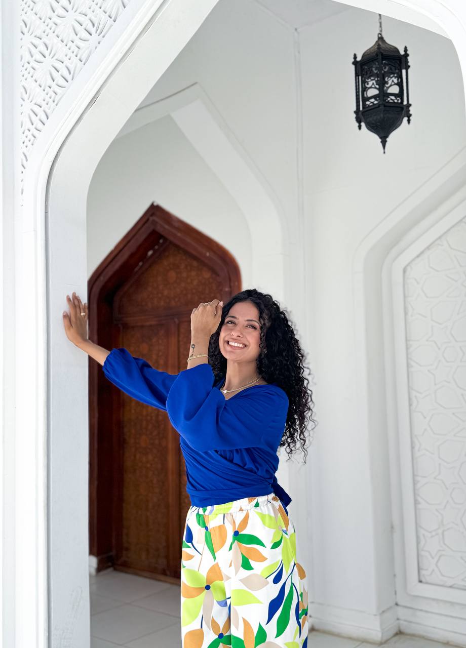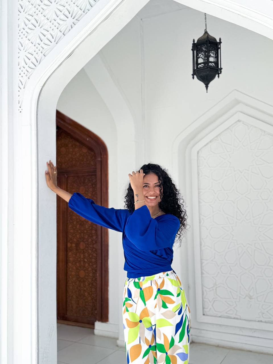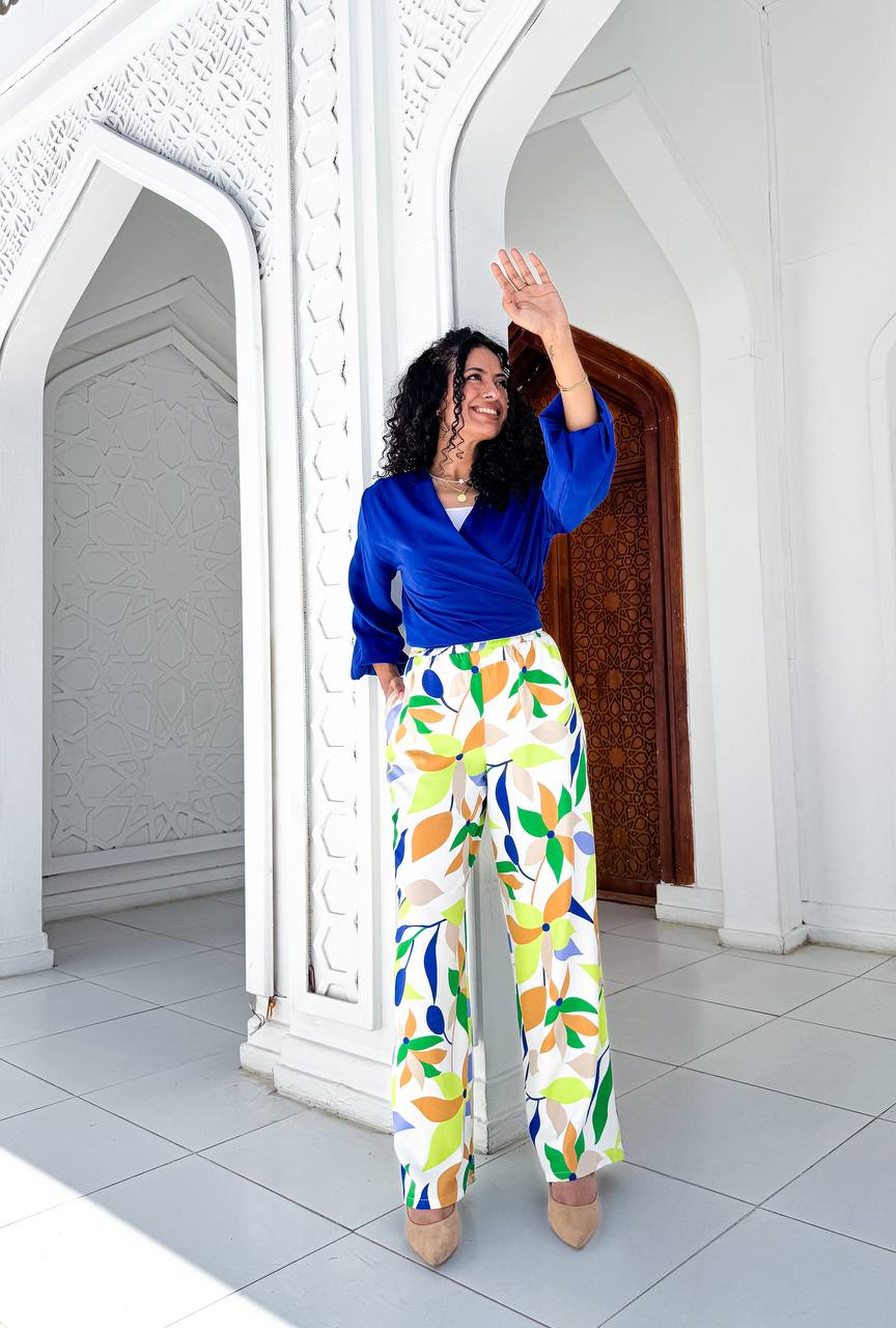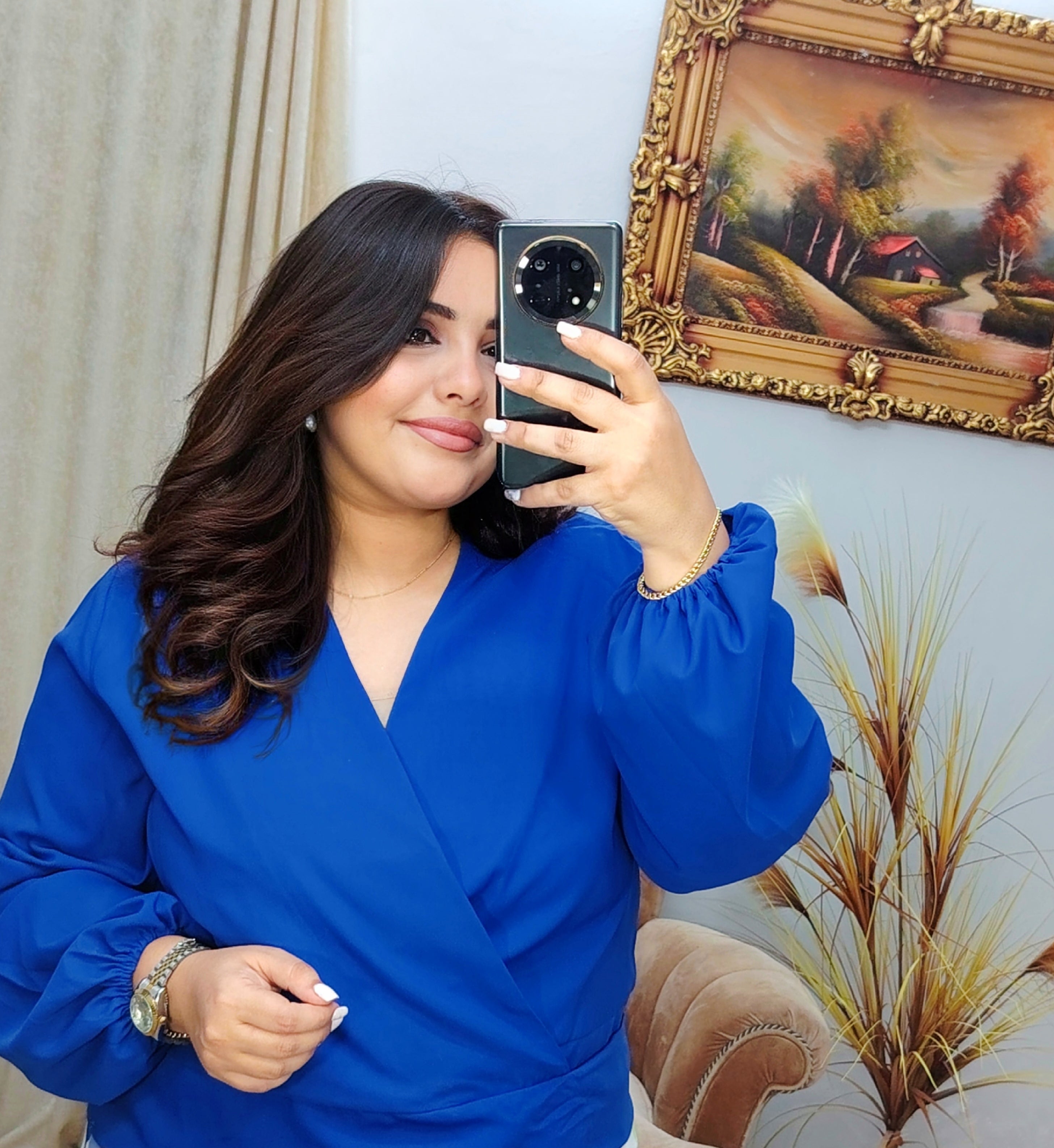 This elegant deep blue blouse features a flattering wrap design that accentuates the waist and adds a touch of sophistication. The long sleeves and soft fabric make it perfect for both casual and dressy looks.