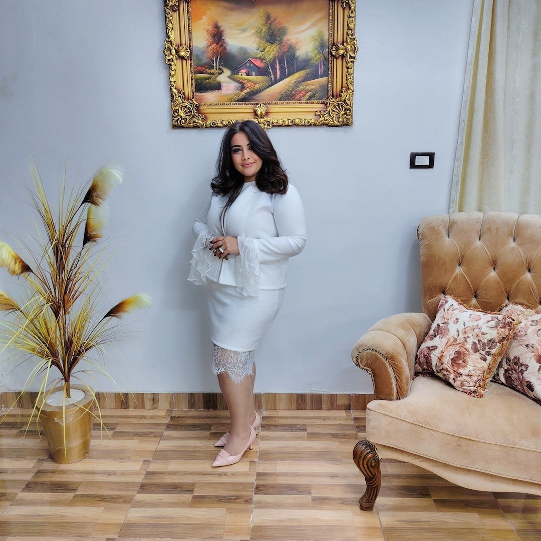 A sophisticated dress crafted from premium wool fabric, enhanced with refined white lace details for a feminine and polished look. Designed for formal occasions and elegant outings, offering structure, comfort, and timeless style.