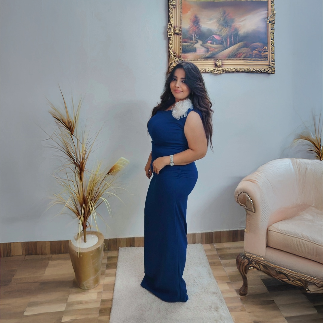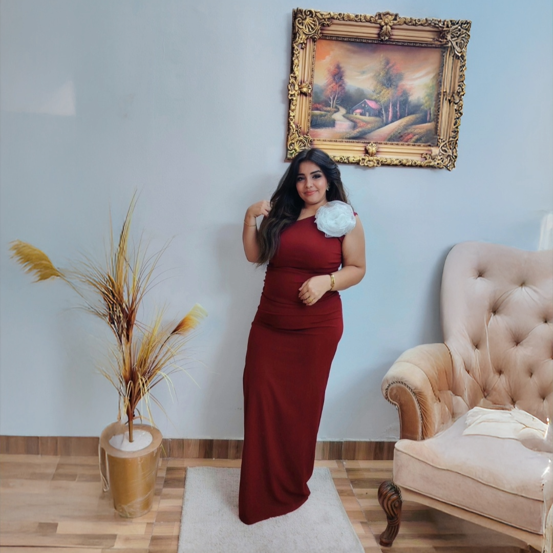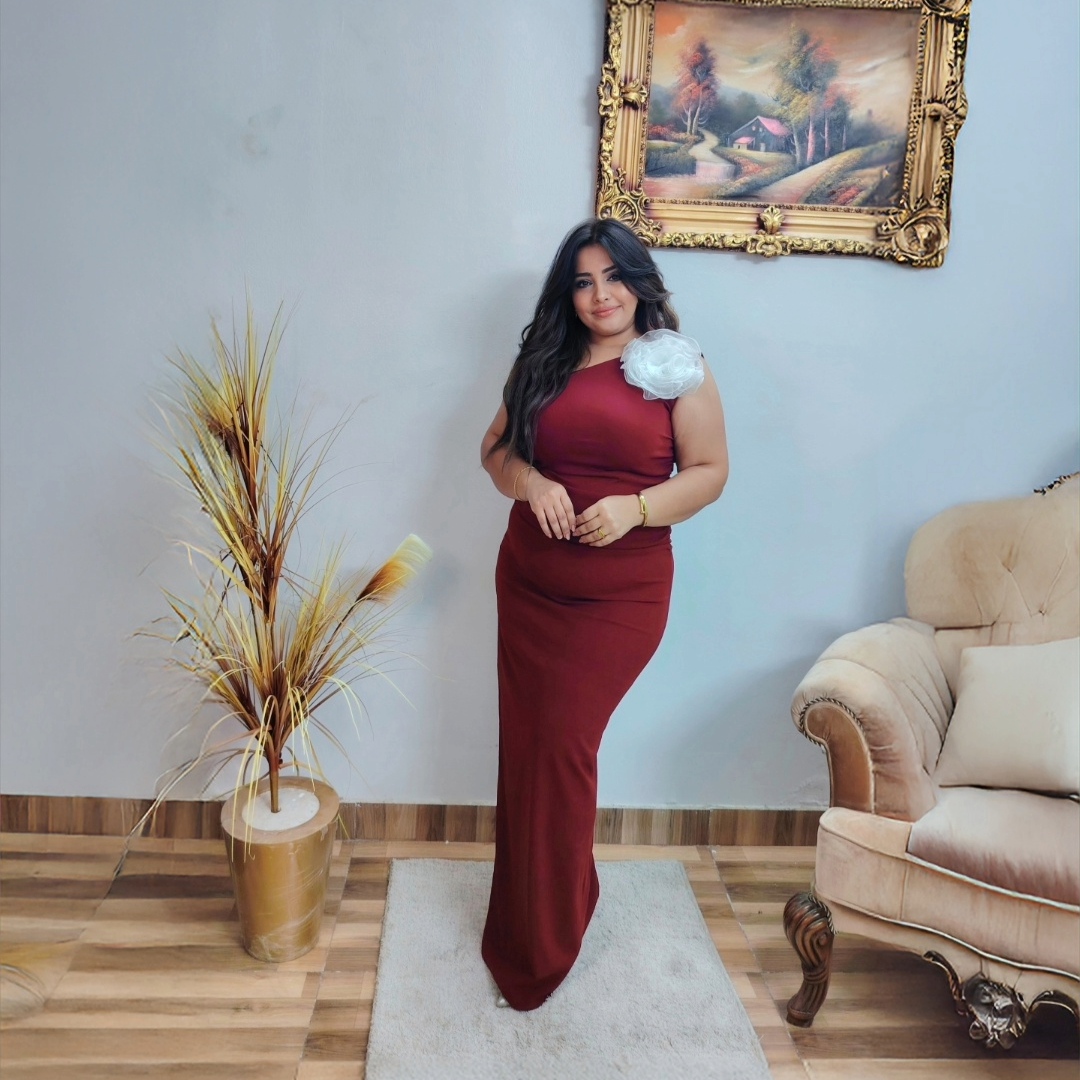 Elegant black evening dress made from premium Scopa Lycra, featuring a unique white floral shoulder accent for a modern and feminine touch. Perfect for special occasions.