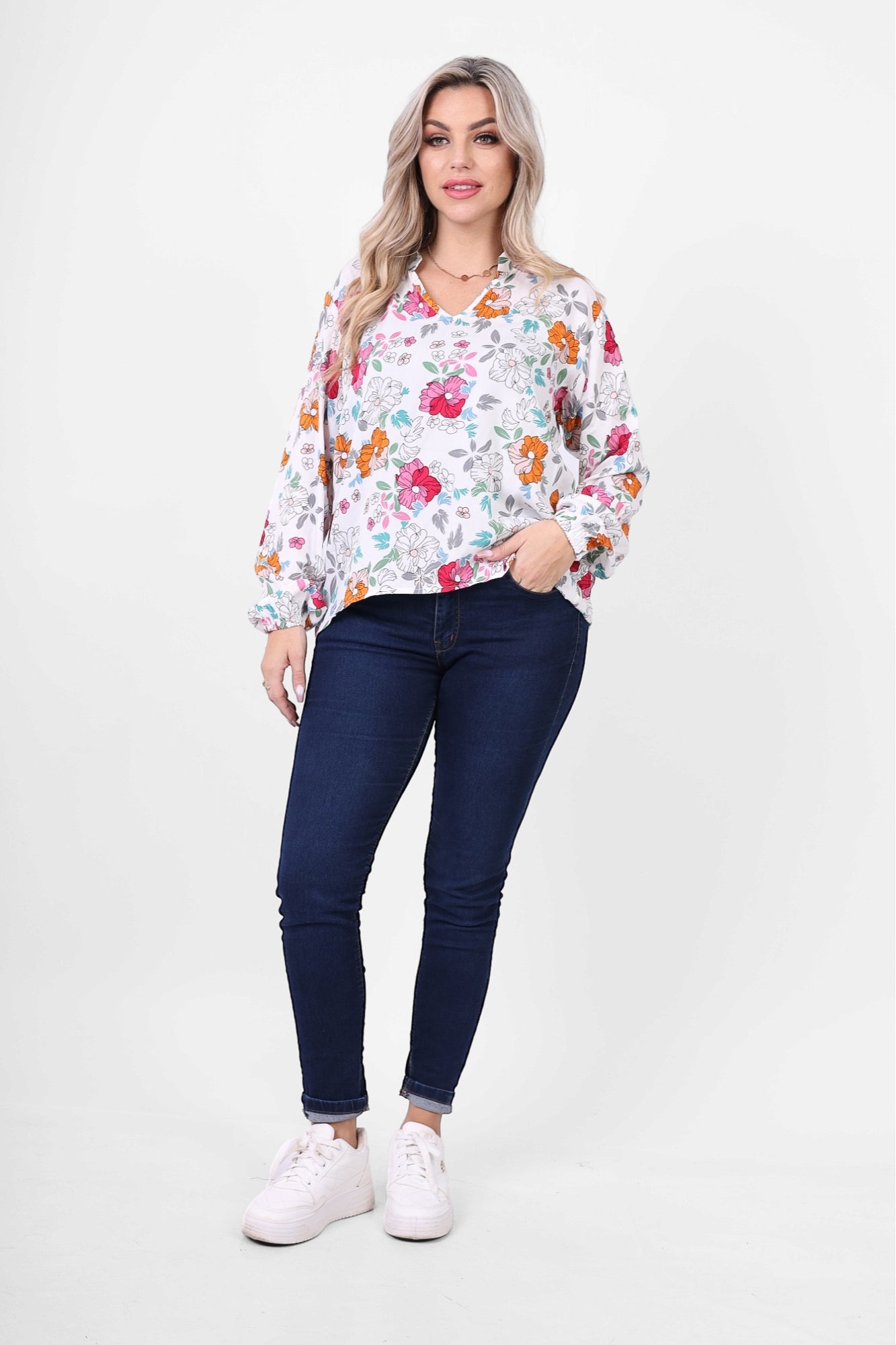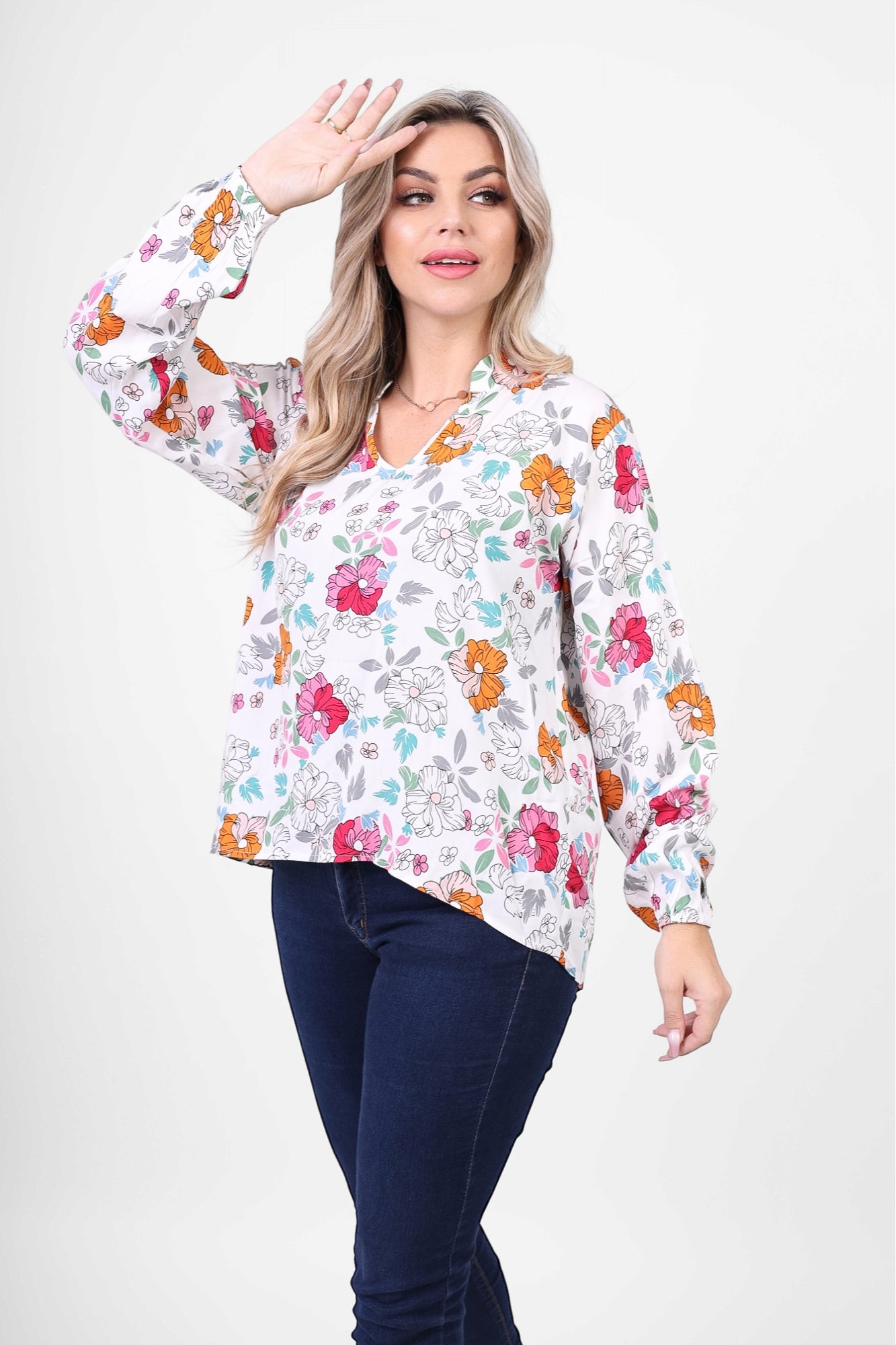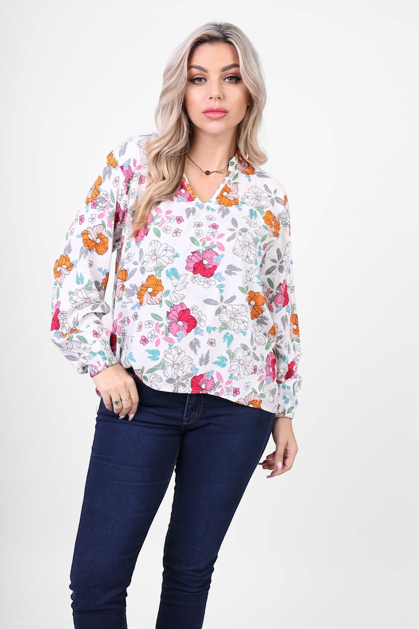 Add a touch of freshness with this Floral Print V-Neck Blouse, featuring a delicate and colorful floral design. Its relaxed fit and lightweight fabric make it perfect for casual outings or everyday chic. Pair it with jeans for a feminine look.