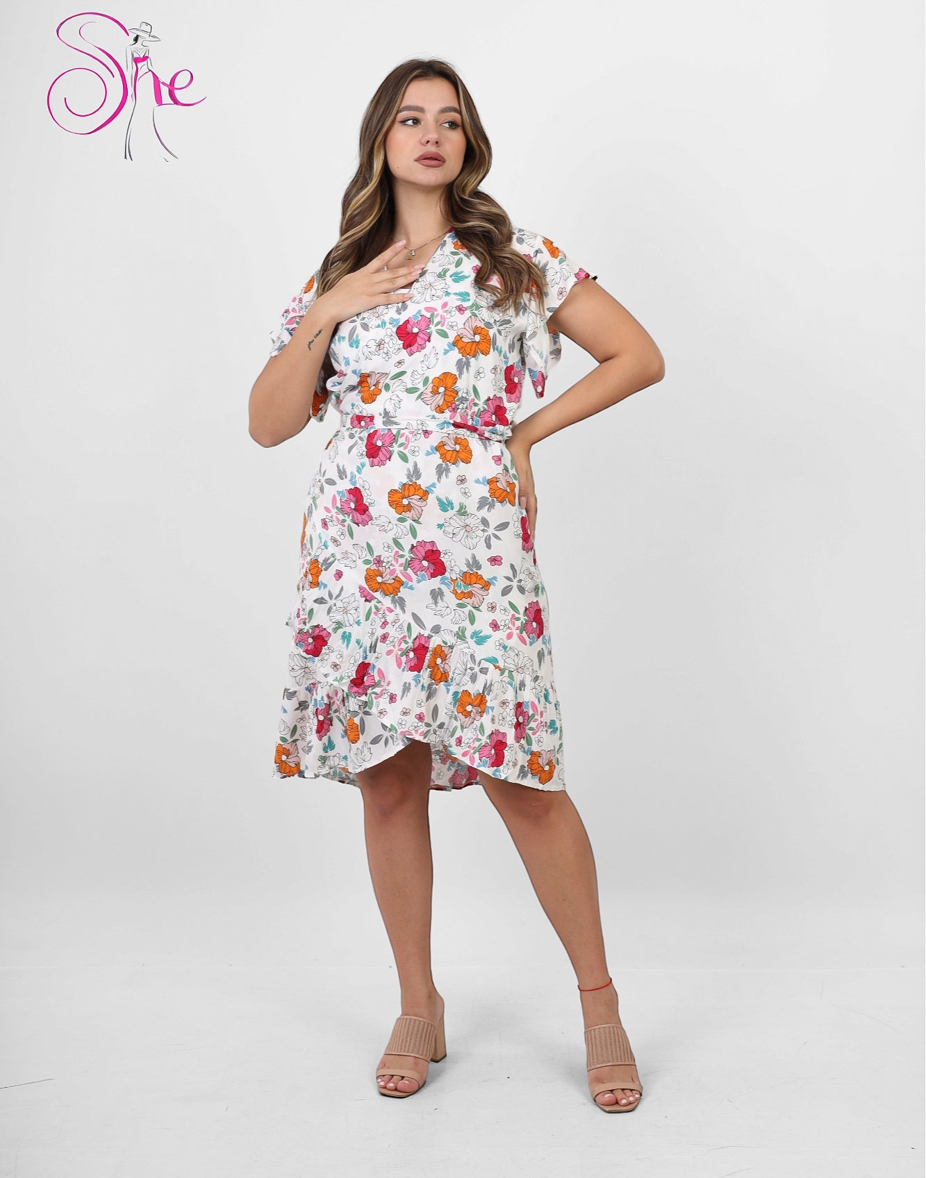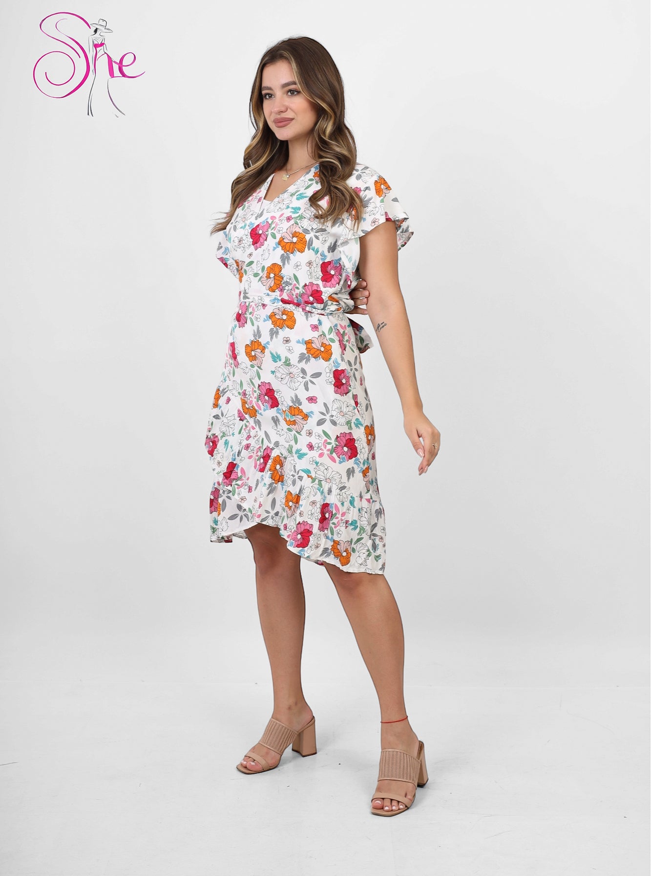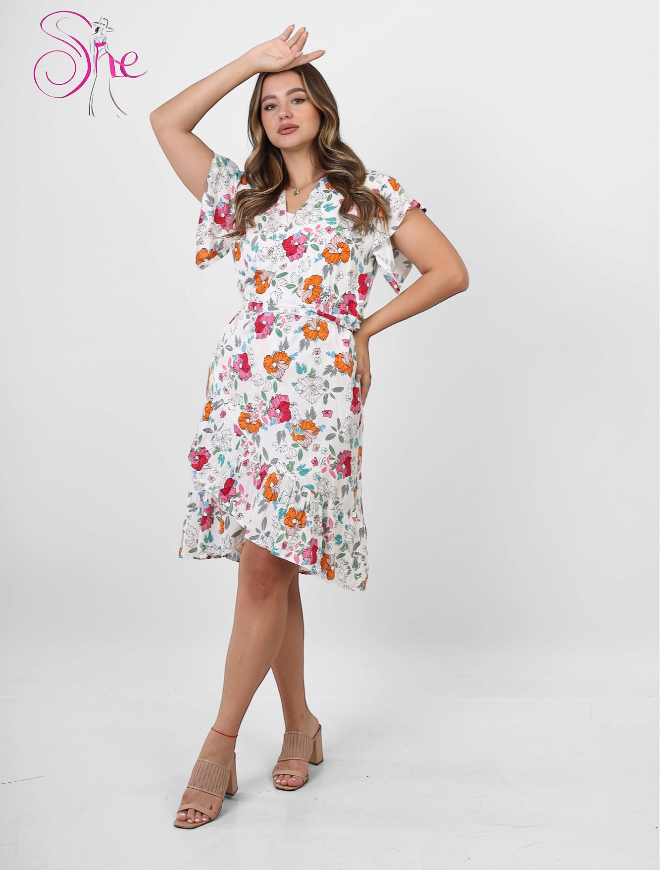 Stay stylish with this floral wrap midi dress, featuring a V-neckline, flutter sleeves, and a wrap-style front. Perfect for summer outings and casual events.